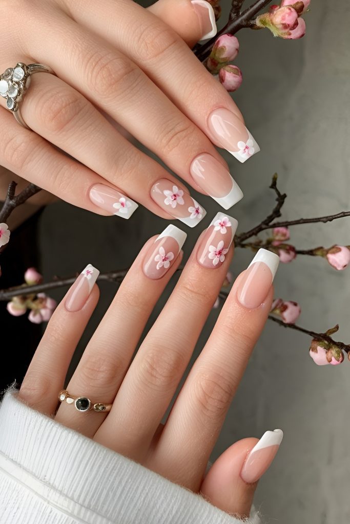 11. Peachy Nude Nails with Tiny Daisy Accents